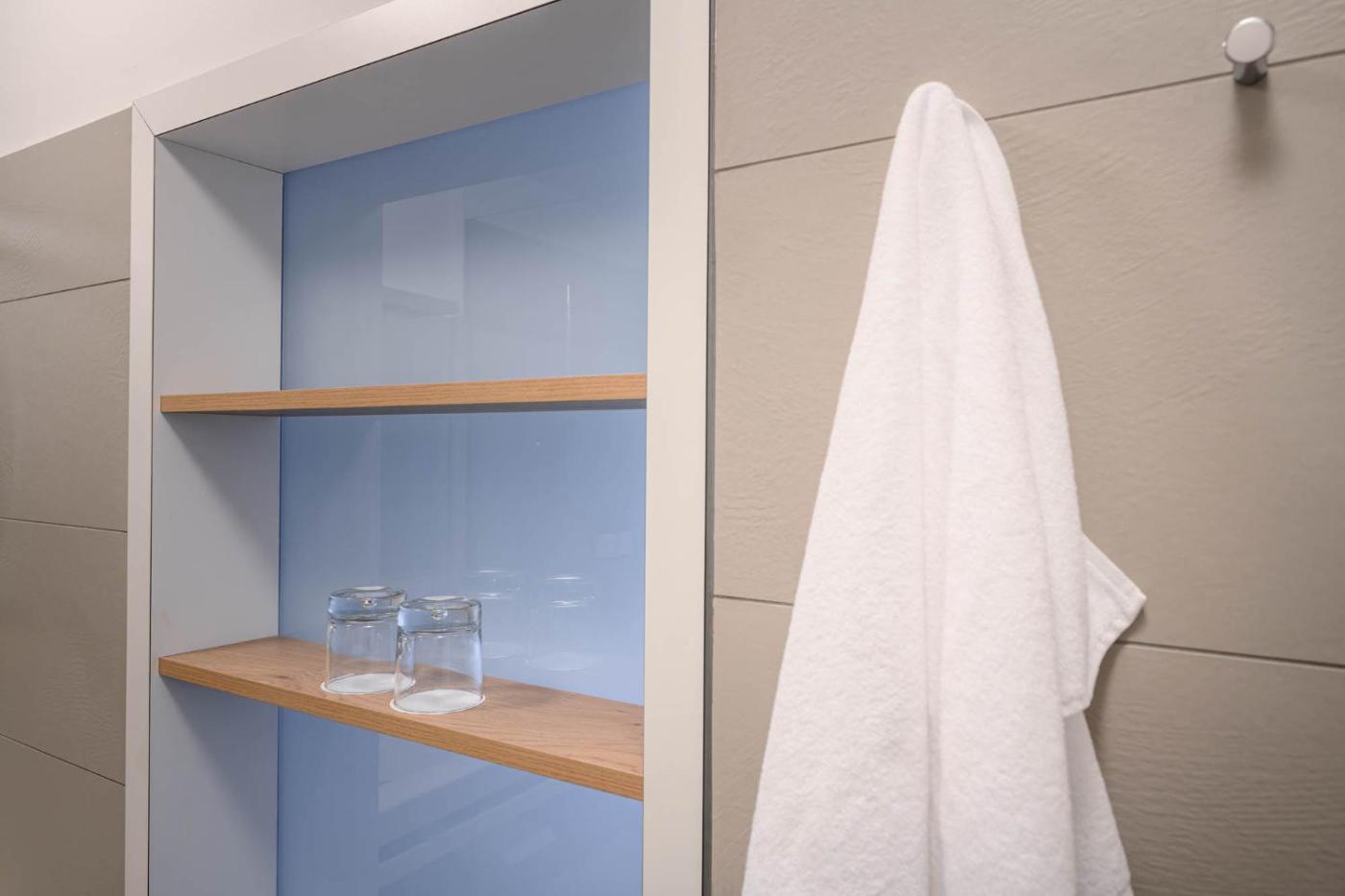 Smart Double Room. Modern, with oiled oak and white accents. Natural, local materials such as the finest oak wood flooring or soft loden. High-quality box spring bed with a width of 160 cm. It offers floor heating in the bathroom, a USB and LED outlet and is soundproof. ;