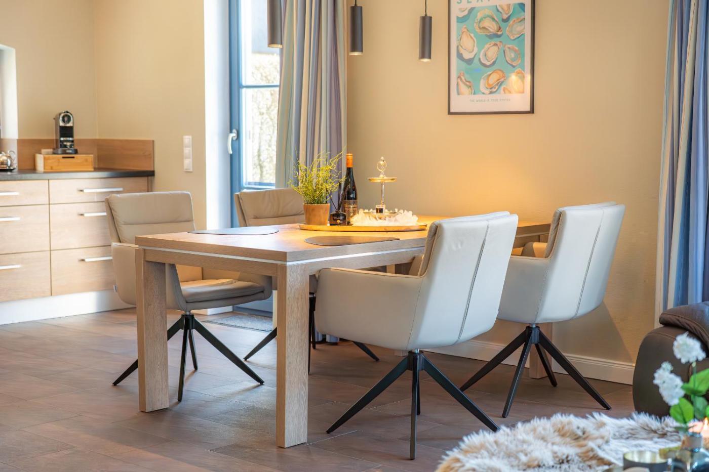 Two-Bedroom Holiday Home. Modern holiday home featuring a separate living area with a dining table, wood-burning stove, and a fully equipped kitchen. It also offers a private sauna. These holiday homes are located at: - Schäferweg 1, Seebad Kölpinsee - Wiesenstrasse 20, Seebad Kölpinsee