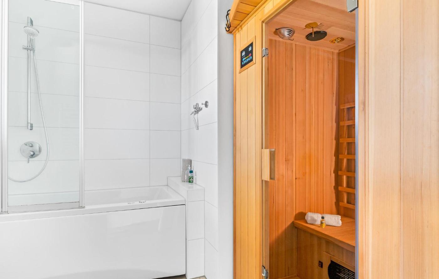 Two-Bedroom Apartment. This luxurious apartment provides a hot tub, a sauna and a fireplace. This spacious apartment comes with 1 living room, 2 separate bedrooms and 1 bathroom with a bath and a shower. Guests will find a stovetop, a refrigerator, a dishwasher and kitchenware in the fully equipped kitchen. The apartment also includes a barbecue. The apartment features a washing machine, a private entrance, a tea and coffee maker, a dining area and a TV. The unit has 3 beds.