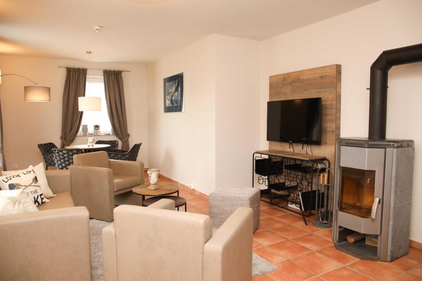 One-Bedroom Apartment with Balcony 5. The fireplace is the standout feature of this apartment. This apartment features 1 living room, 1 separate bedroom and 1 bathroom with a bath and a shower. The apartments kitchenette, which has a refrigerator and a dishwasher, is available for cooking and storing food. Boasting a balcony, this apartment also features a barbecue, heating and a TV with cable channels. The unit has 2 beds. ;