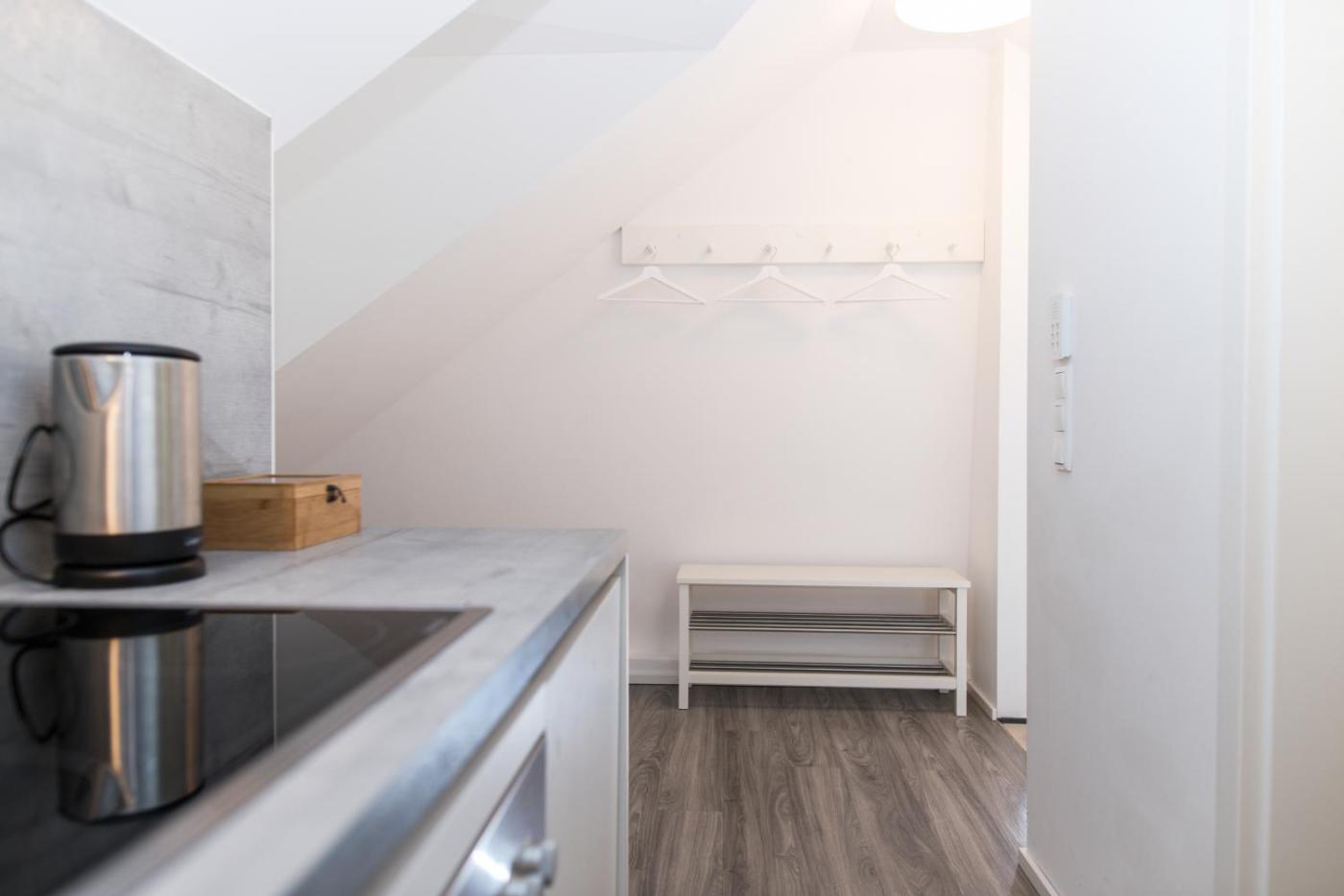 Studio Apartment. This apartment consists of a kitchen, a seating area, 1 separate bedroom and 1 bathroom with a bath and a shower. In the well-equipped kitchen, guests will find a stovetop, a refrigerator, a dishwasher and kitchenware. The apartment provides a tea and coffee maker, a dining area, a wardrobe, a flat-screen TV with streaming services, as well as ancourtyard view. The unit offers 3 beds. ;